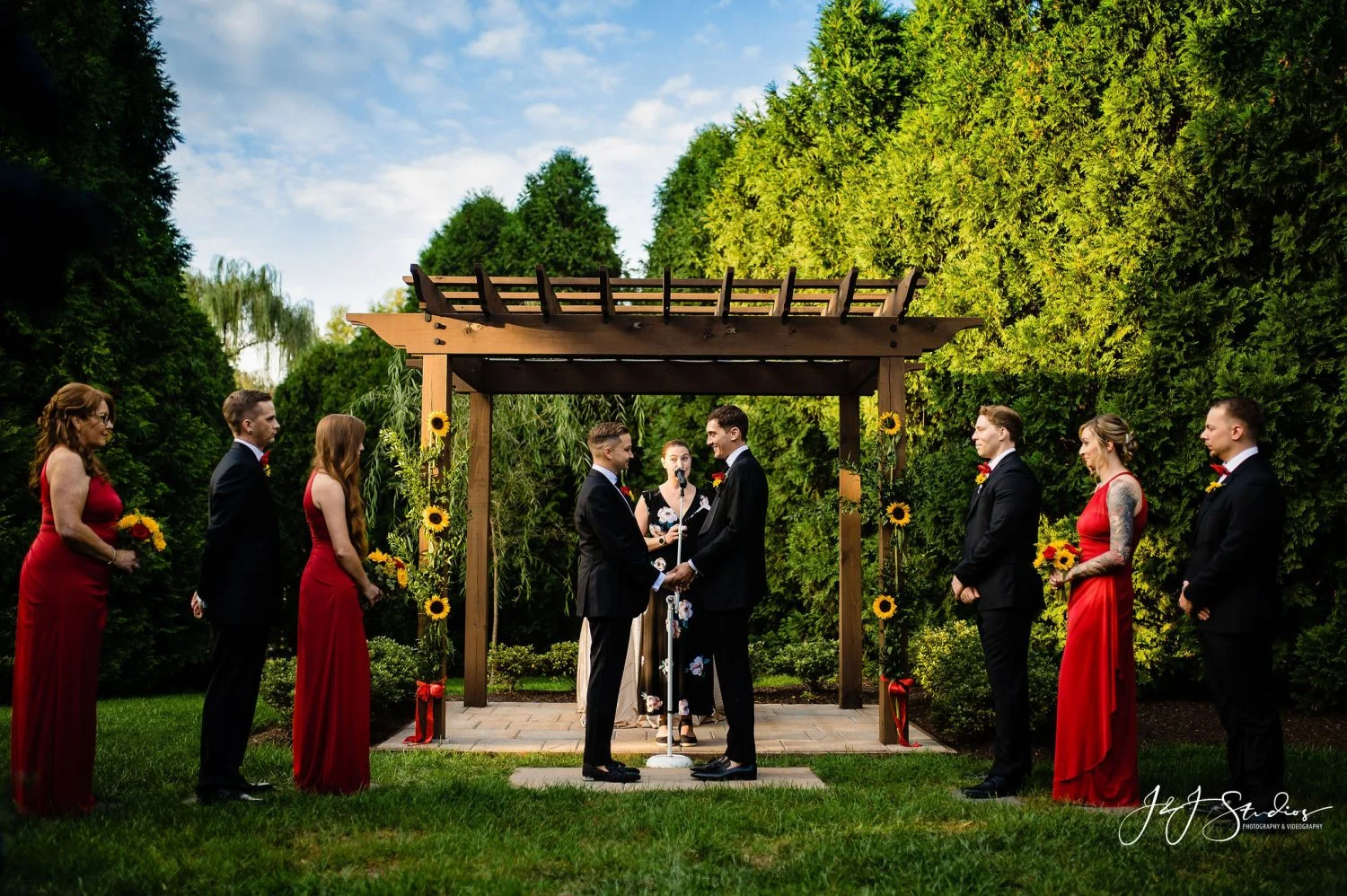 The Farmhouse Wilmington, a conveniently located historic estate in Wilmington, Delaware, is the perfect country wedding venue for gay weddings. With the ability to host up to 190 guests, this venue offers an expansive outdoor deck and patio, indoor and outdoor bars, a cozy indoor lounge with a fireplace, and dressing suites with private bathrooms. The four acres of grounds and gardens provide countless picture spots, including an outdoor ceremony space under willow trees and a pergola.